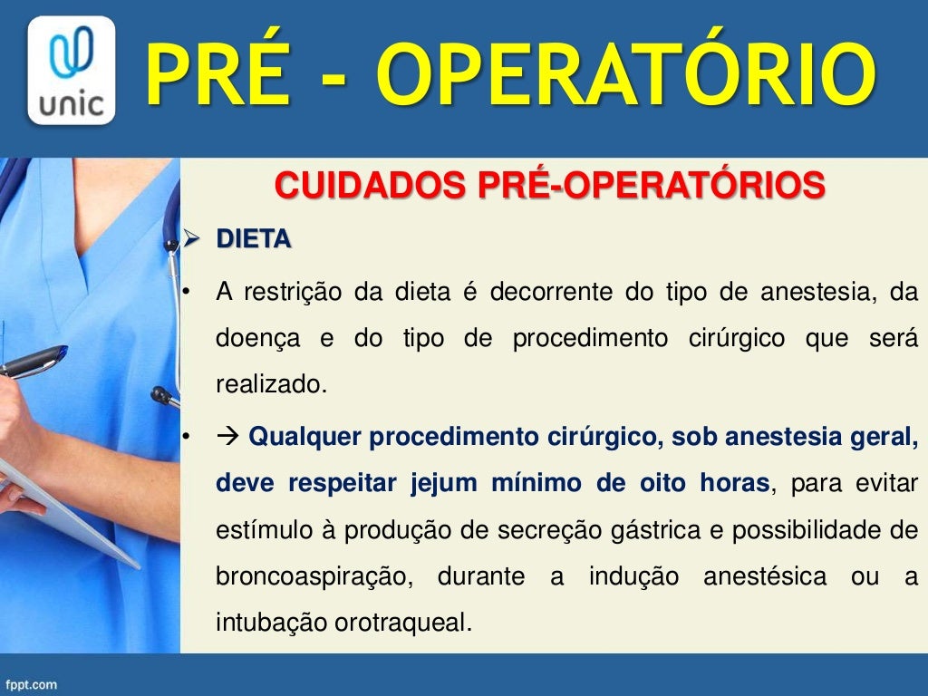 - Jejum: Instruir o paciente sobre o período de jejum necessário antes da cirurgia, conforme a prescrição médica, para evitar vômitos e aspiração pulmonar durante a anestesia.